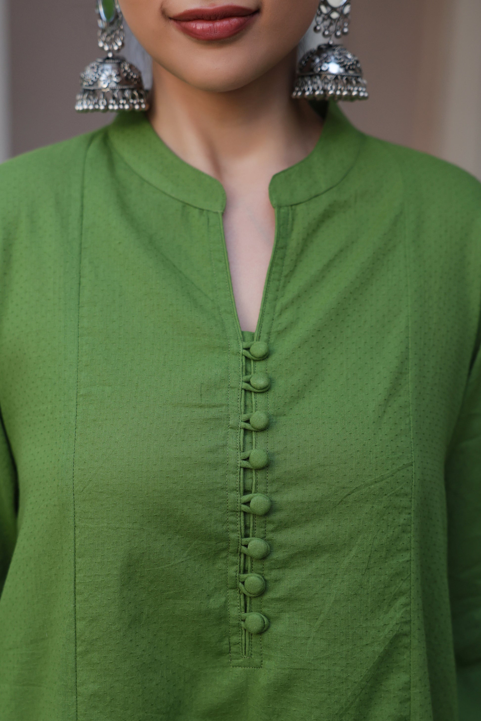 This Kurta Set has a flat collared, bell sleeves oversized kurta along with a printed salwar having a fully elasticated waistband.