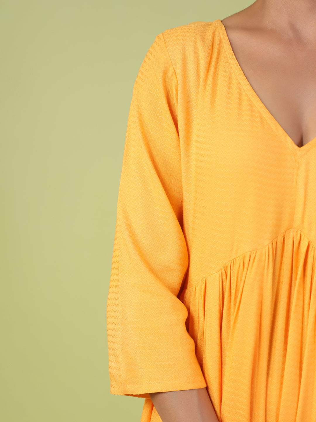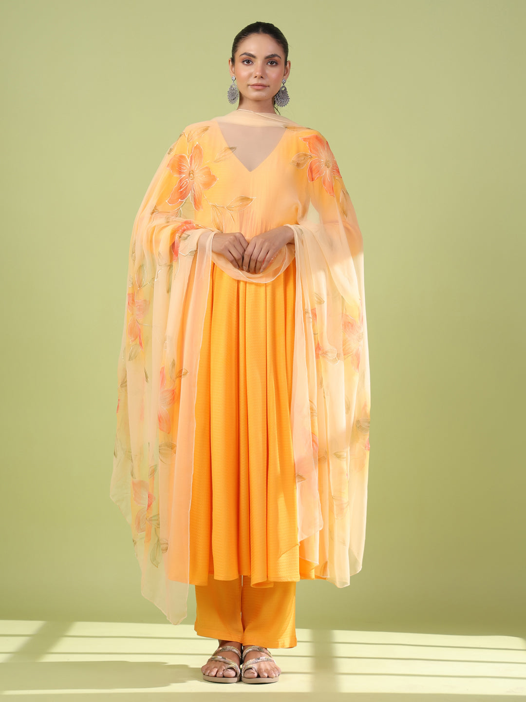 This Kurta Set has a V neck, 3/4th sleeves, empire waist kurta with gathers at the bust along with a matching straight trouser having a partially elasticated waistband. The set comes with a floral printed dupatta.