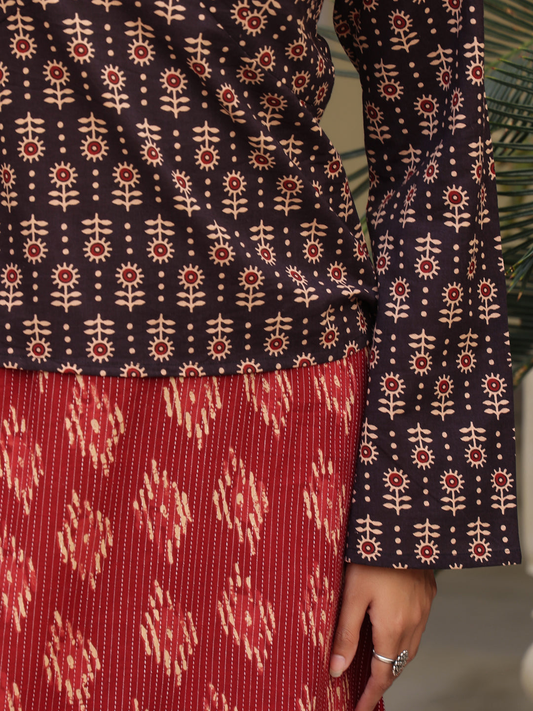 This Set has a V neck, flared sleeves top along with a straight long skirt with a side slit having a partially elasticated waistband.