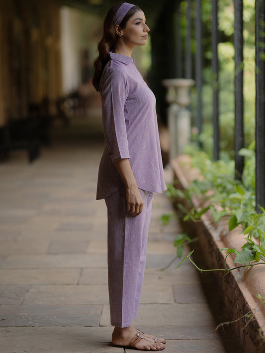 | Women's Purple Cotton Collared Short Kurta Top with Trousers | Rs. 1,120 |