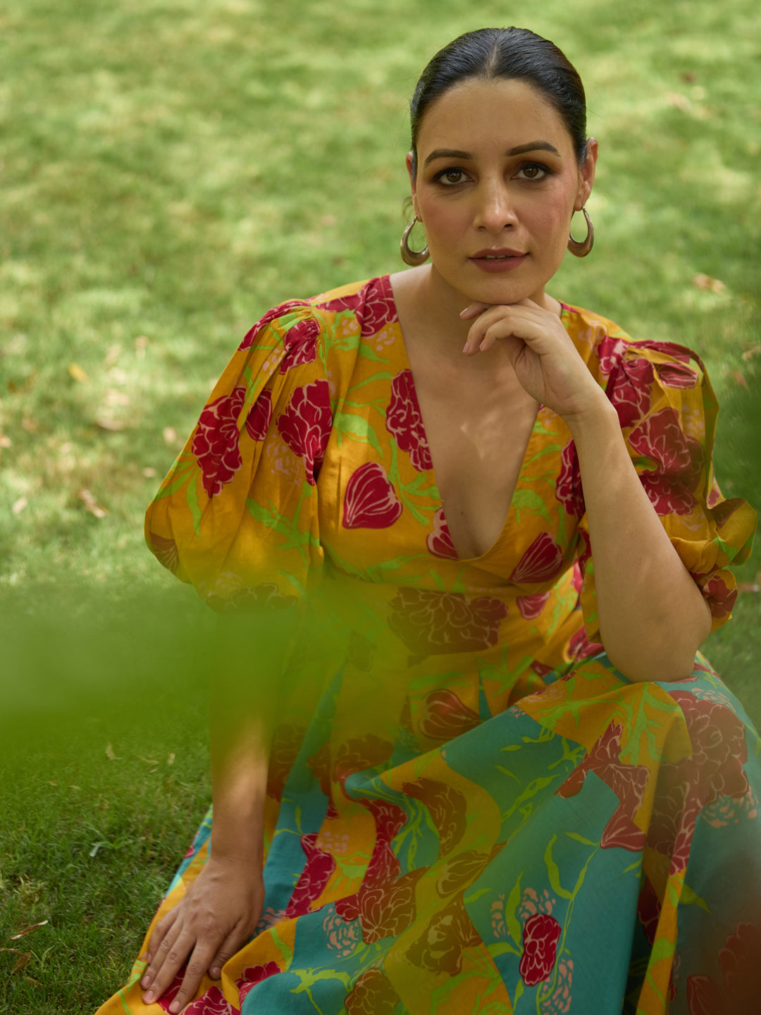 It is a fit and flare panelled long dress with an empire waistline and balloon sleeves