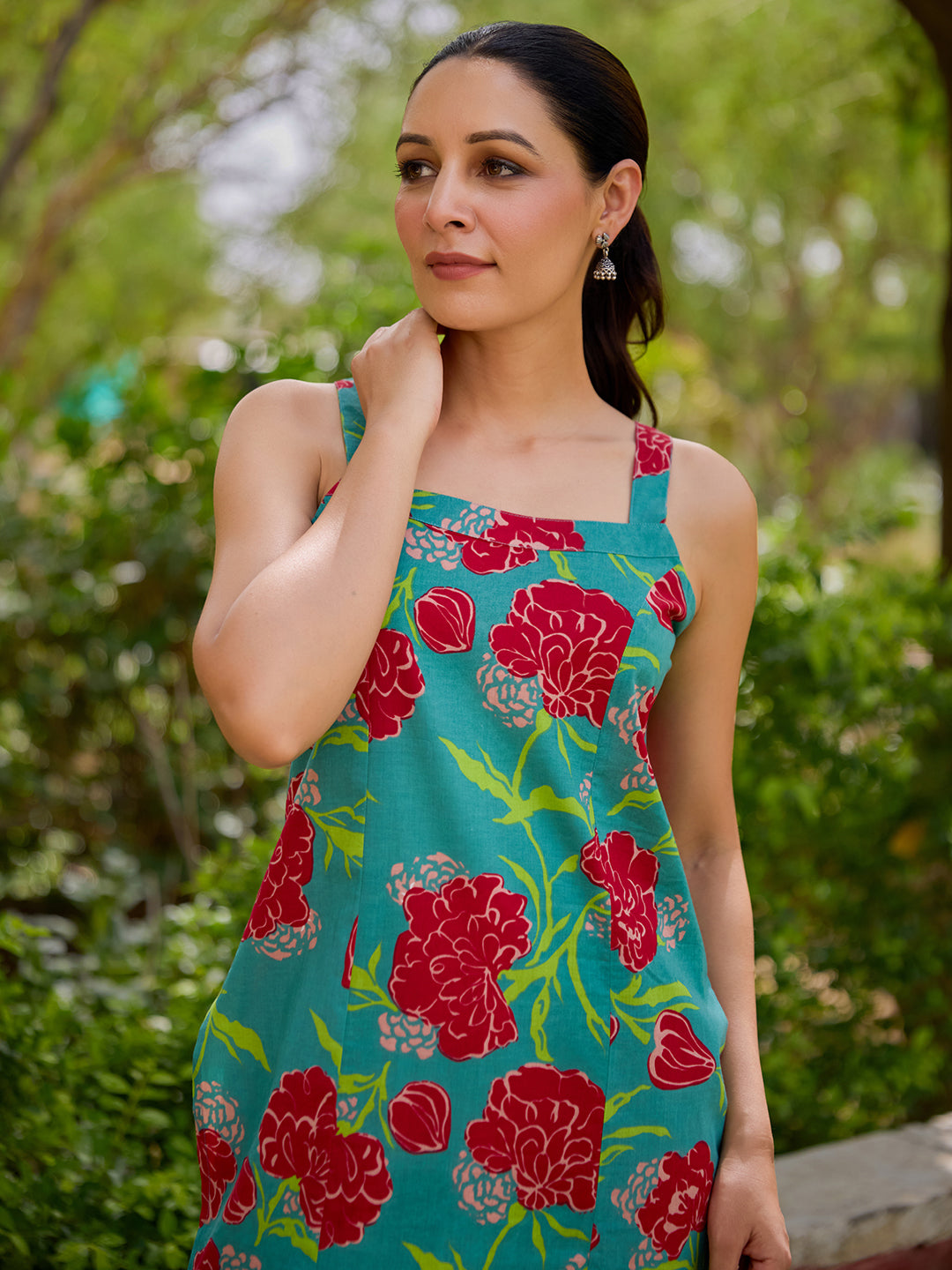 This Kurta Set has a square neck, strappy, straight kurta along with a matching straight trouser having a partially elasticated waistband.