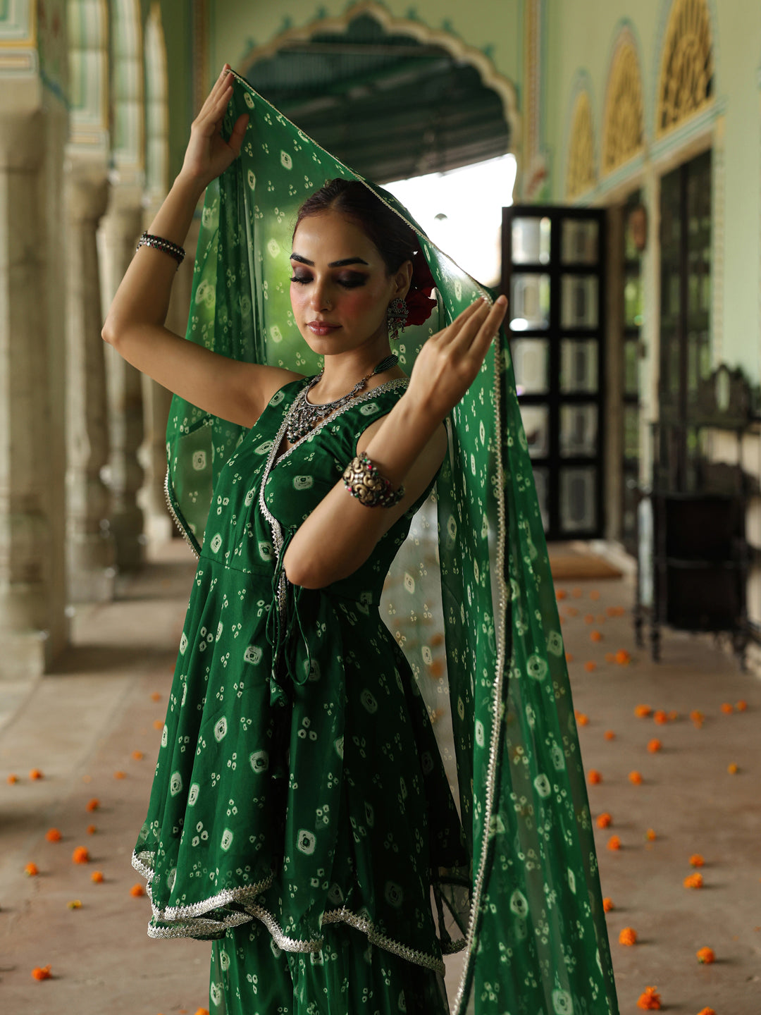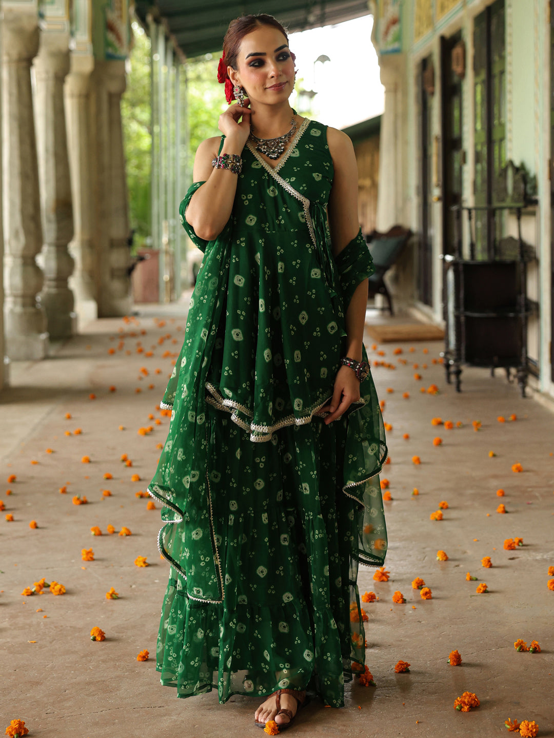This kurta set has a sleeveless short peplum angrakha style kurta along with a tiered sharara having a fully elasticated waistband. The set comes with a matching flowy dupatta with gota detailing.