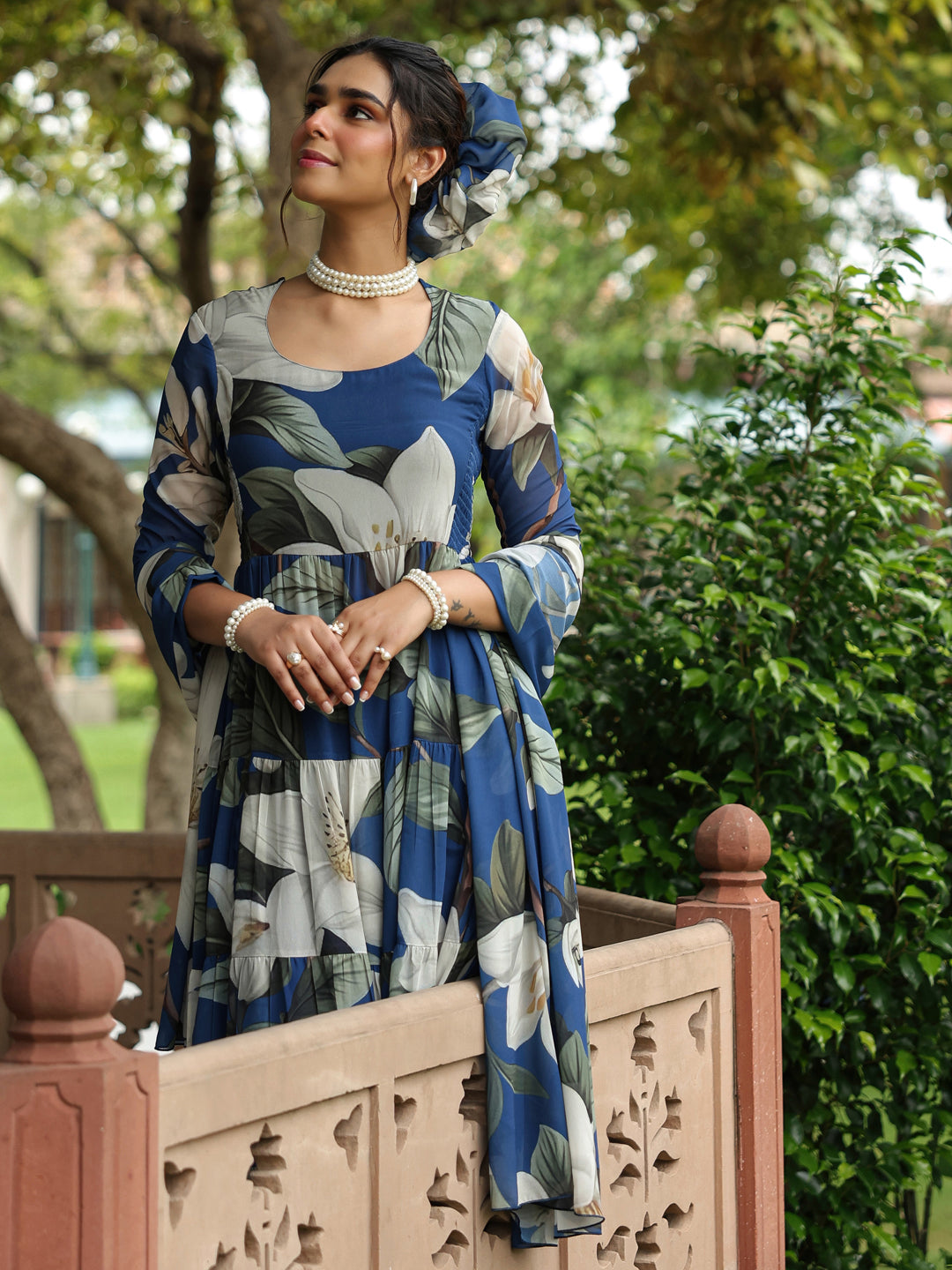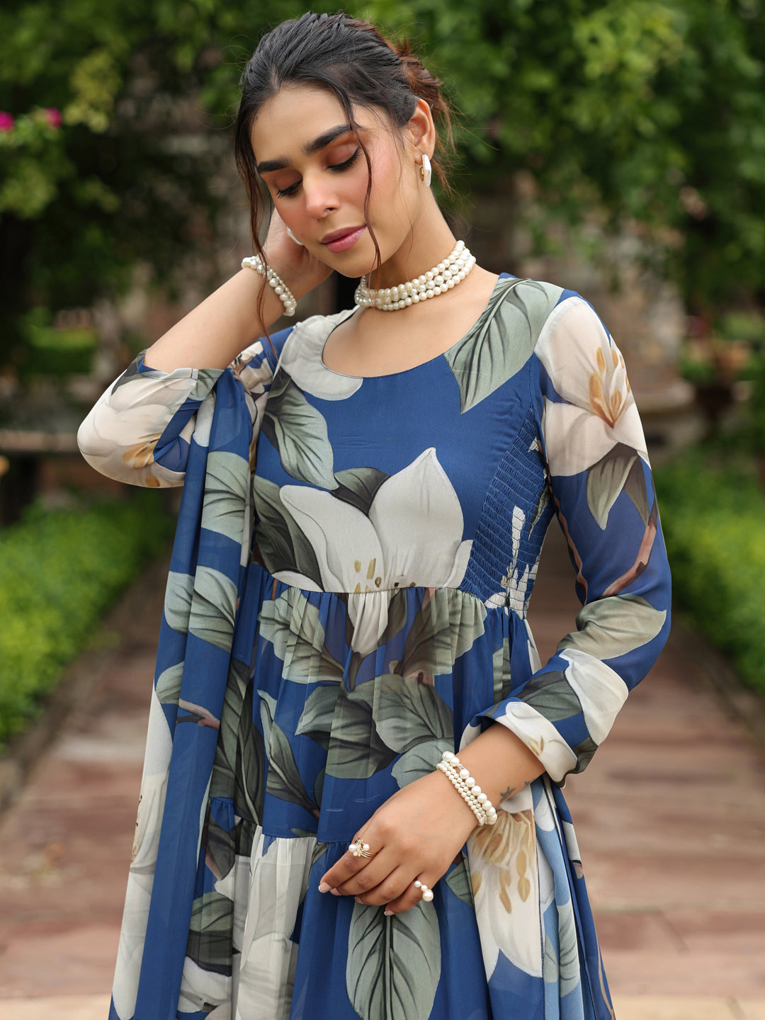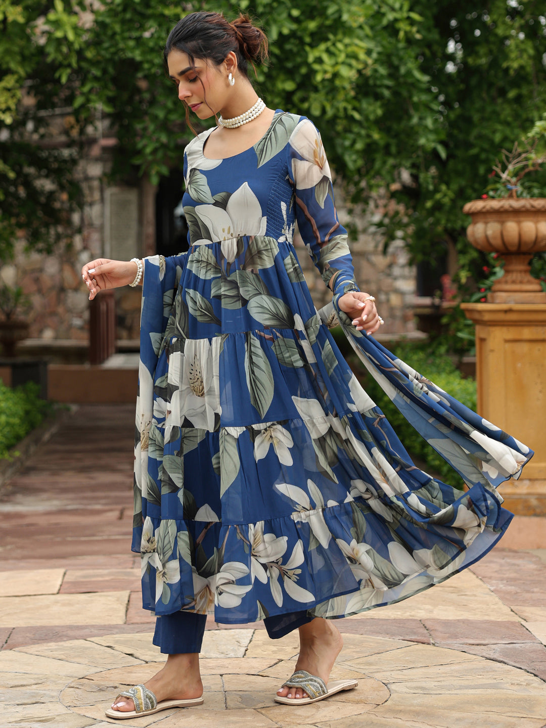 It is a flared anarkali kurta with 3/4th sleeves along with a straight trouser having a partially elasticated waistband. The set come with a matching dupatta .