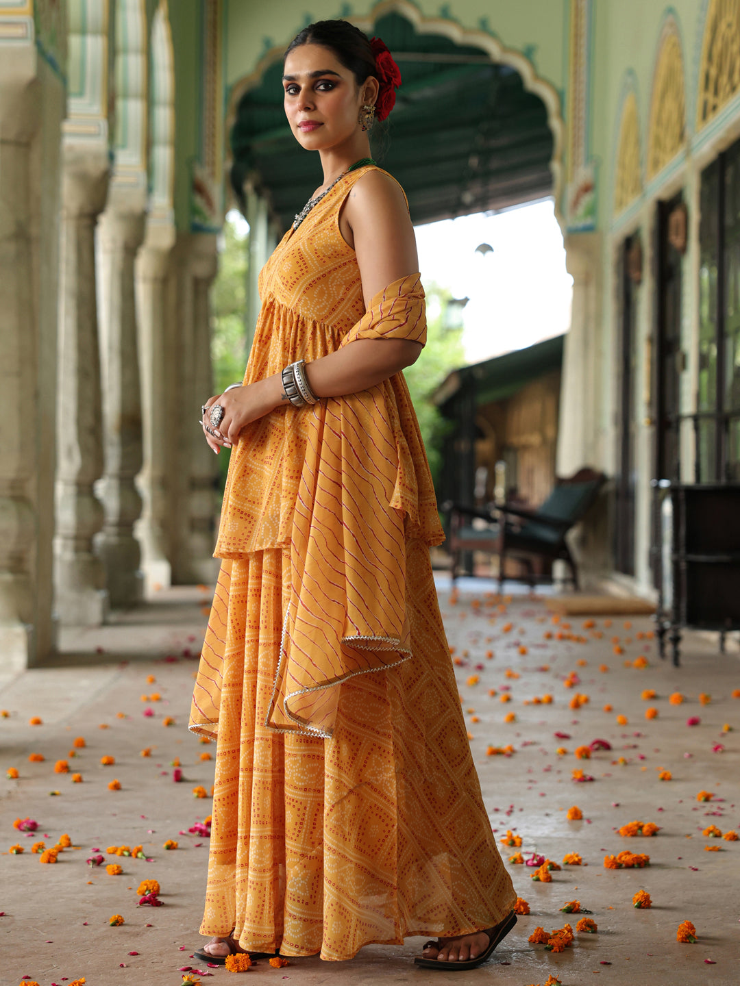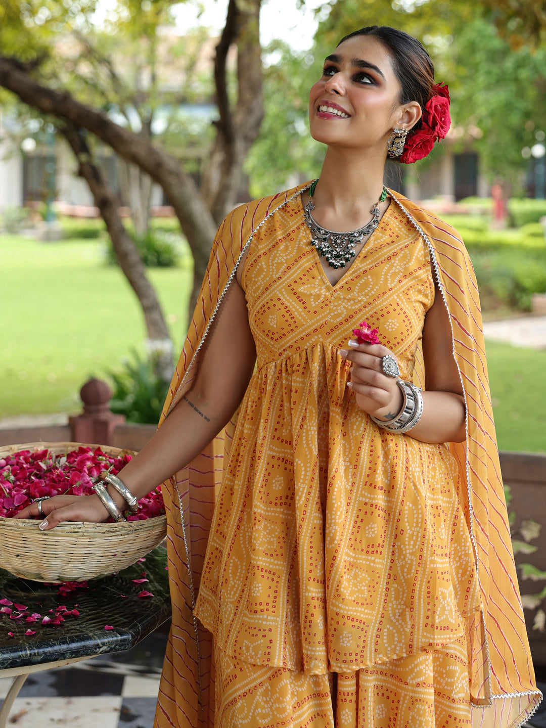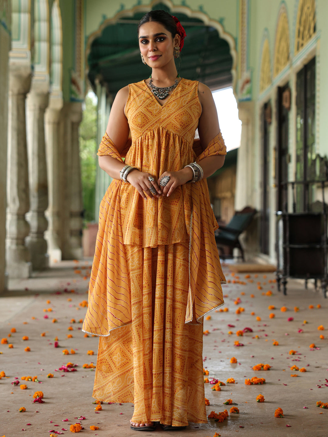 It is a bandhani skirt set with a sleeveless, short peplum style kurti along with a flared skirt having a fully elasticated waistband. The set comes with a flowy dupatta with gota detailing.