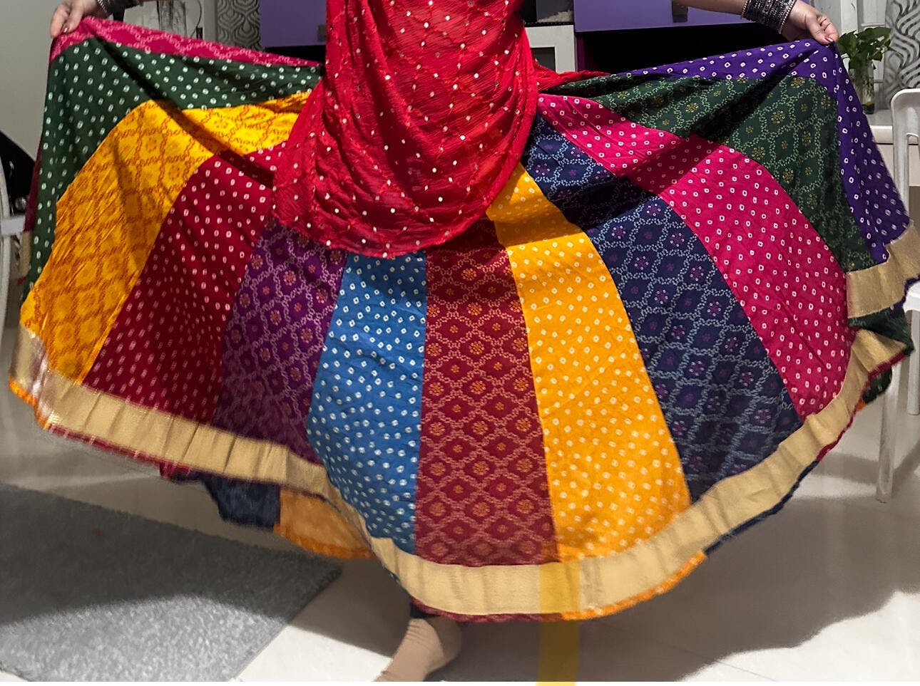 It is a Multi coloured Bandhani printed, flared Skirt with gota detailing at the hemline and a fully elasticated waistband.