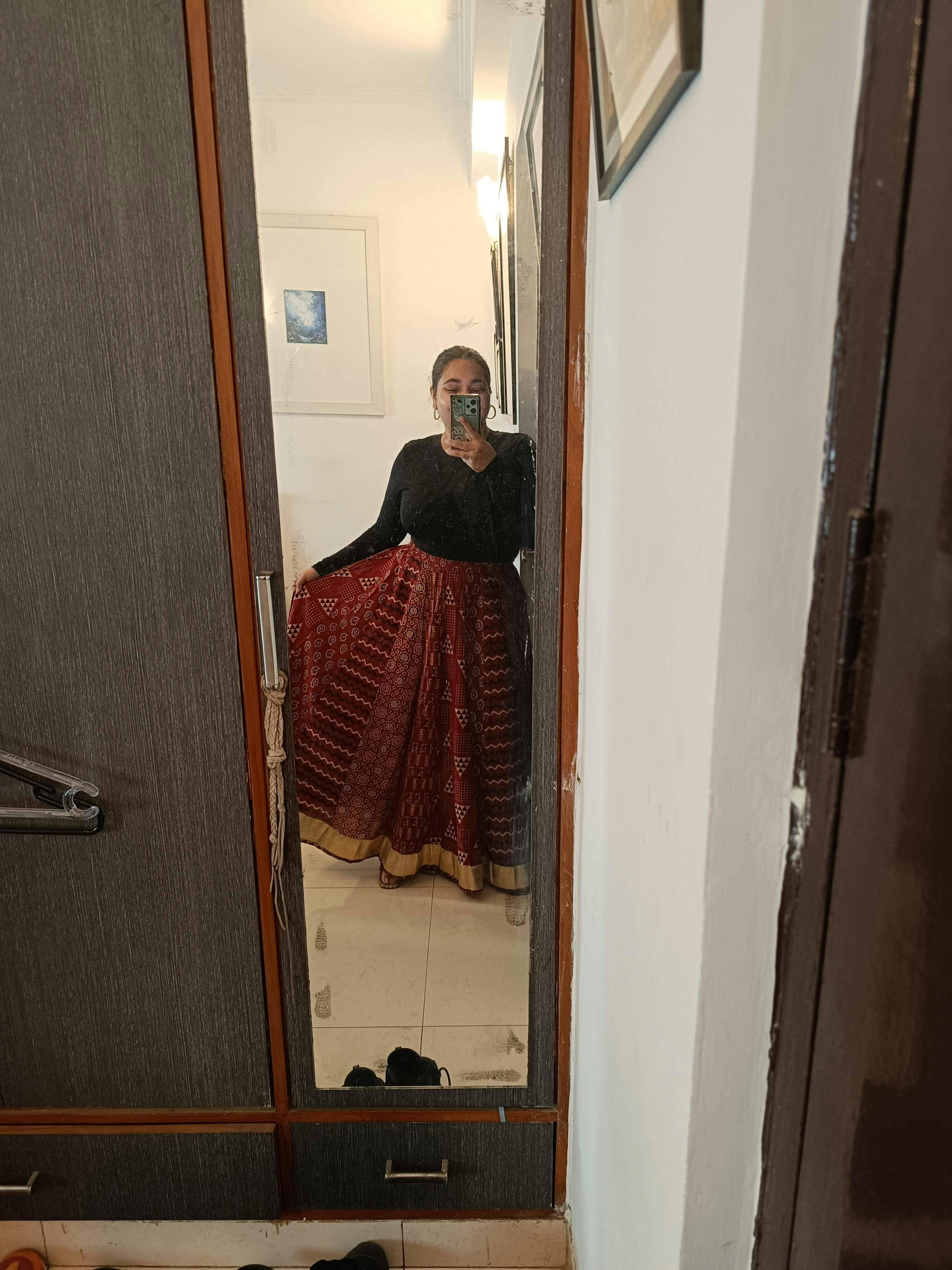 What a beautiful maroon skirt. Perfect with a nice subtle black top. The fall and the shape is perfect. The material is also very soft and comfortable. The first thing I bought from here and it's perfect.