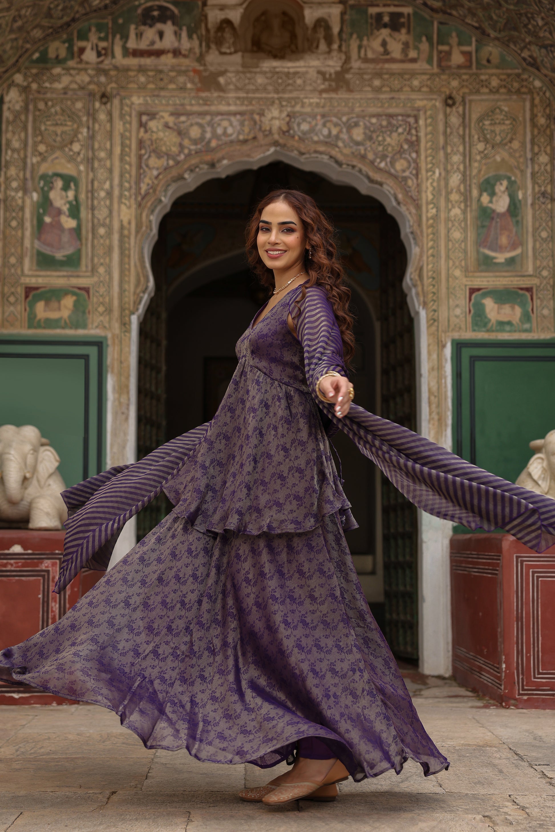 It is a Skirt Set with a sleeveless, short, peplum style kurti along with a matching flared skirt having a fully elasticated waistband. The set comes with a flowy dupatta with woven detailing.