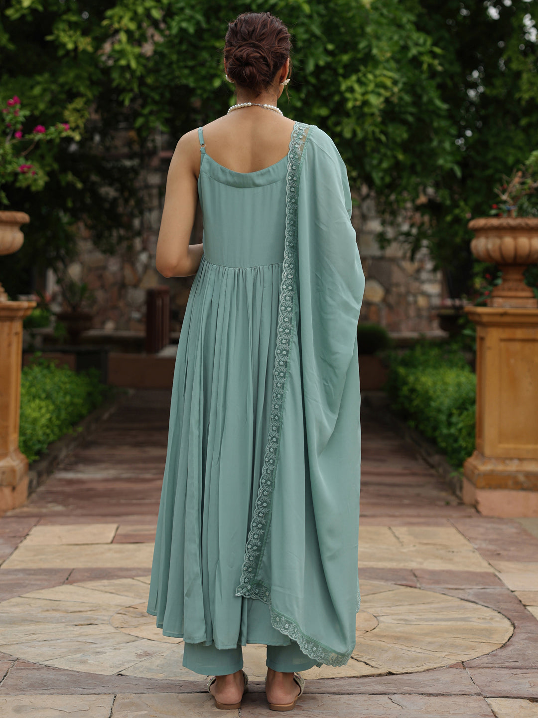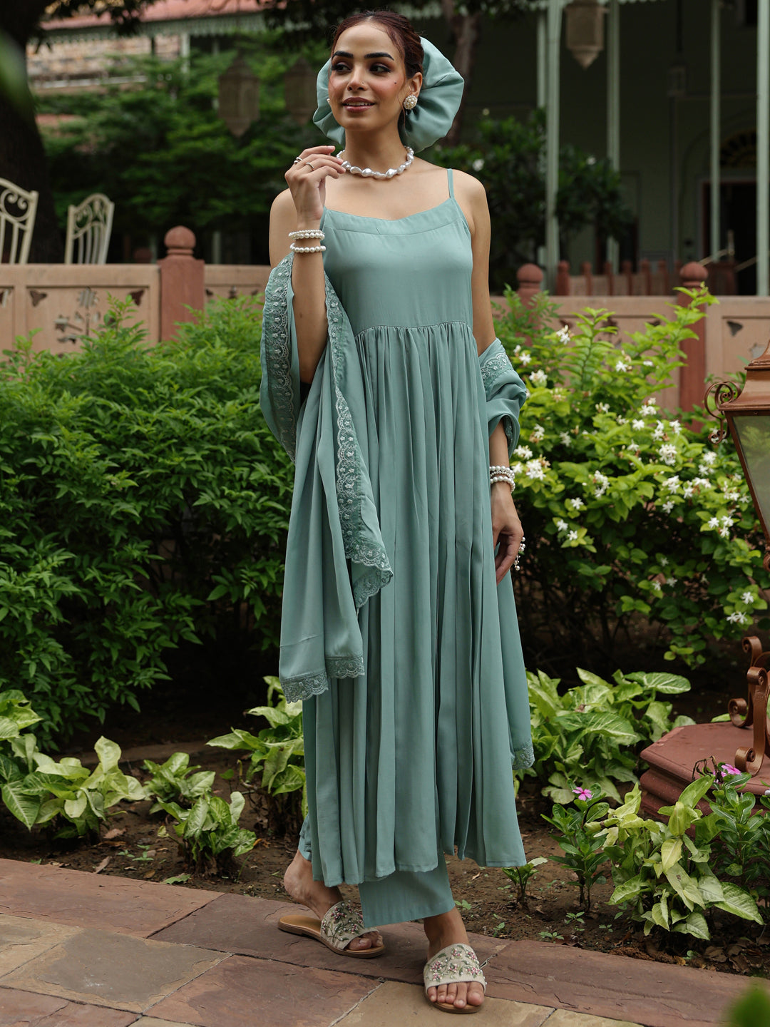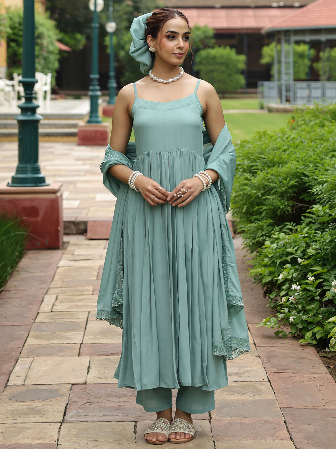 It is a pastel blue anarkali, sleeveless, flared Kurta with spaghetti straps along with a matching straight trouser having a partially elasticated waistband. The set come with a matching dupatta with lace details.