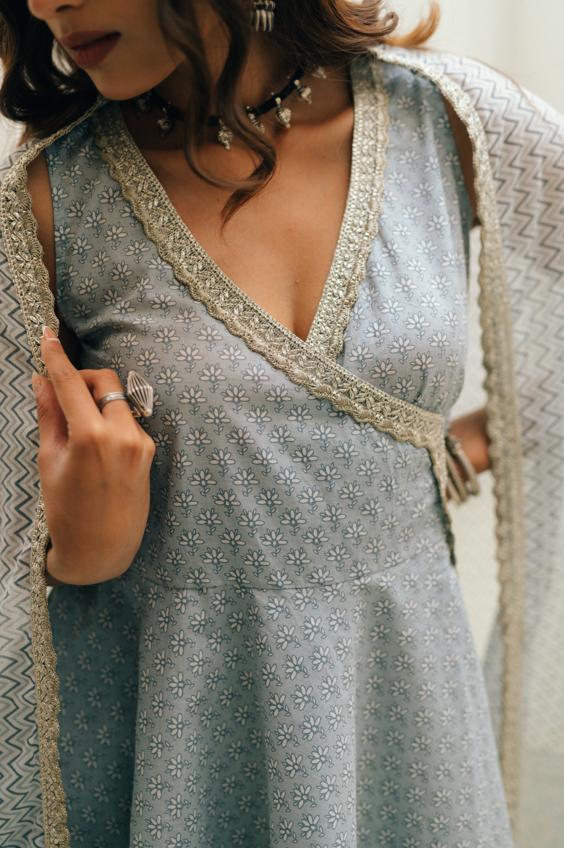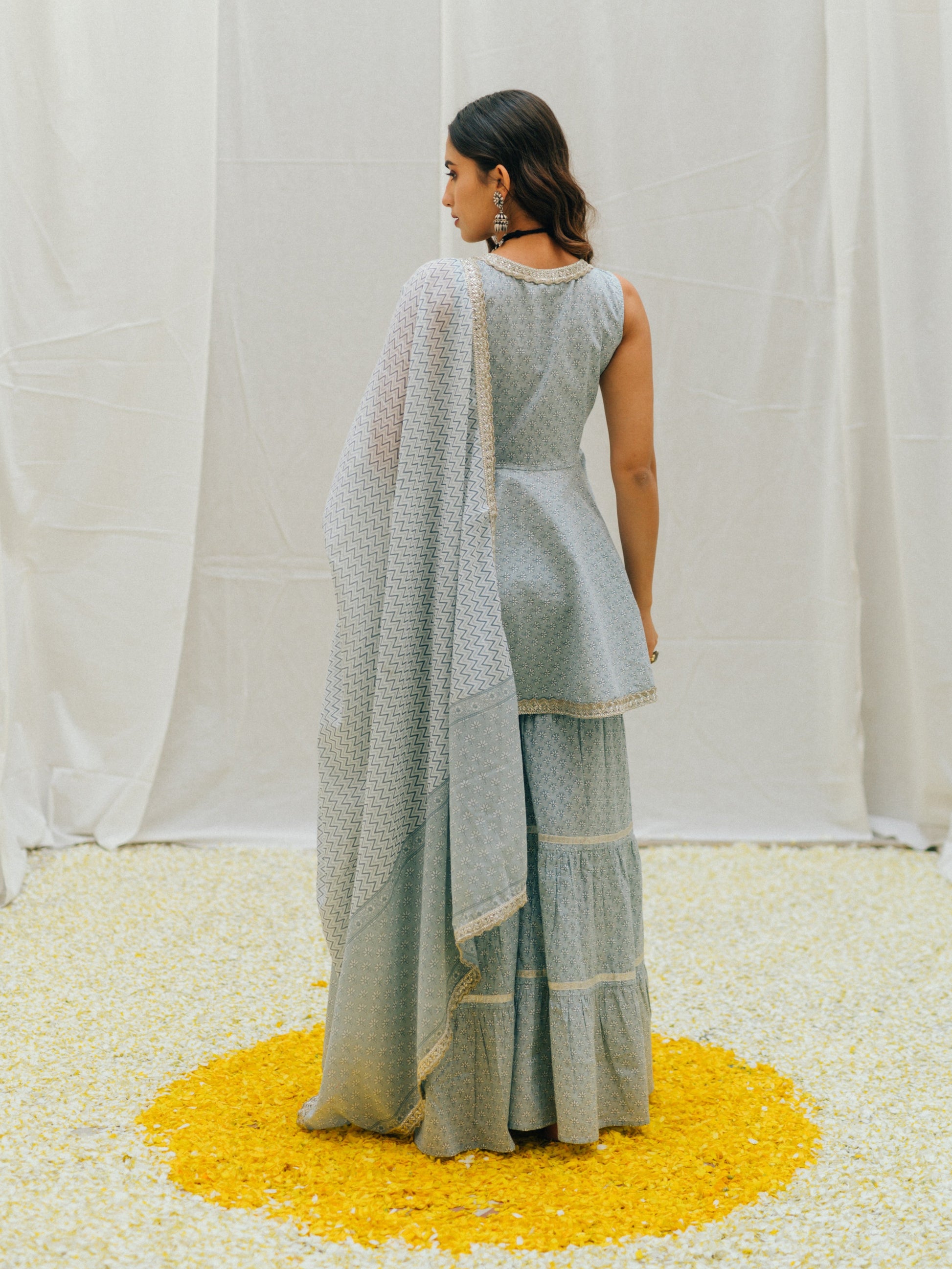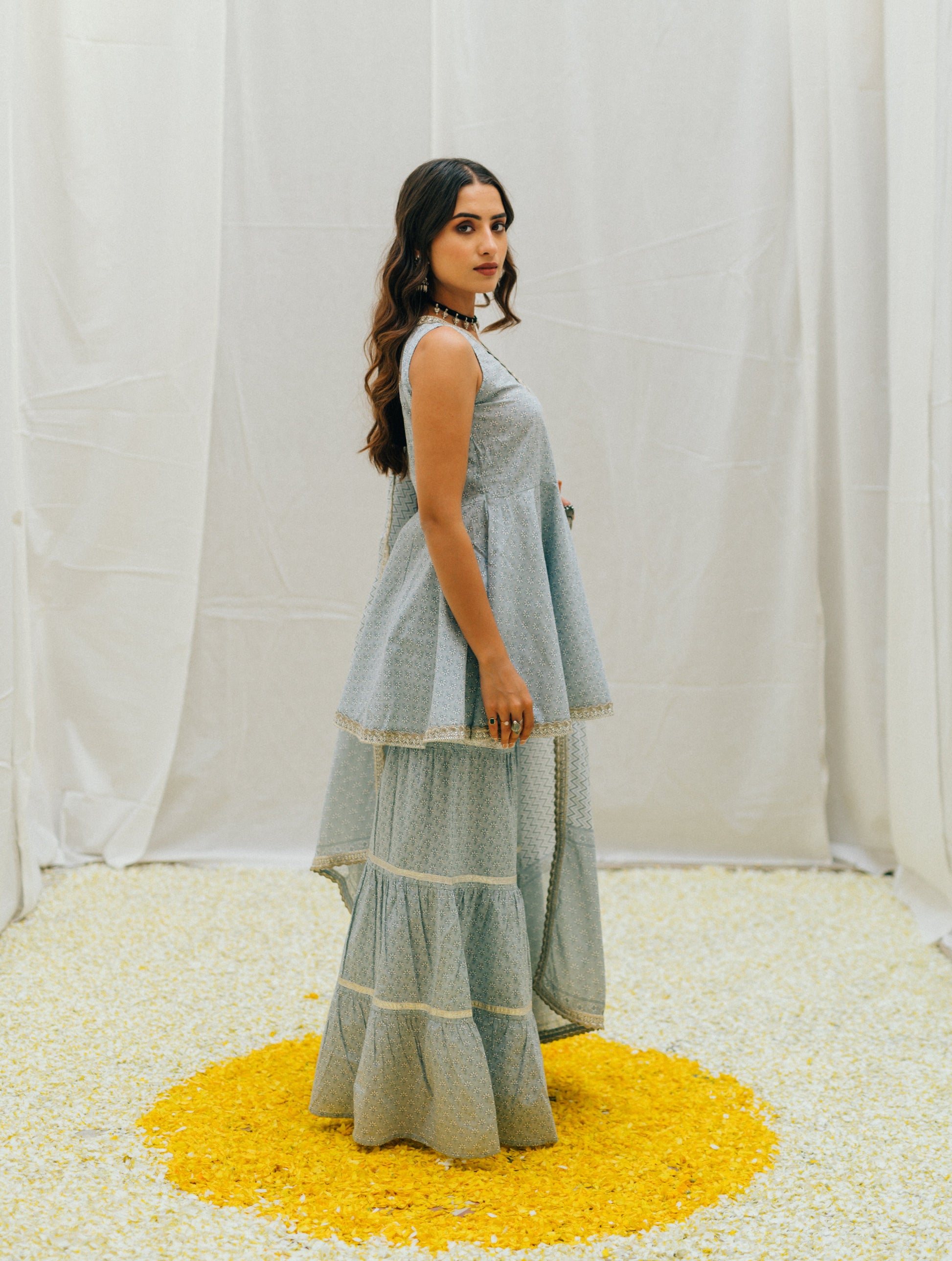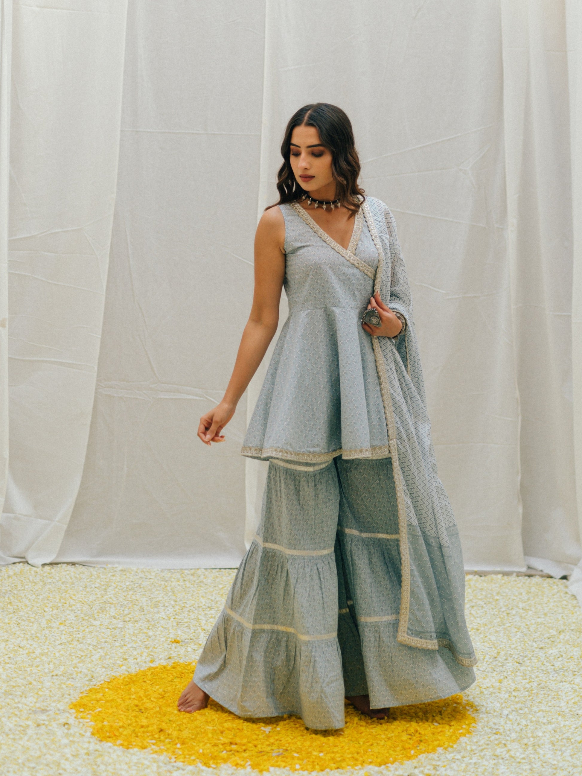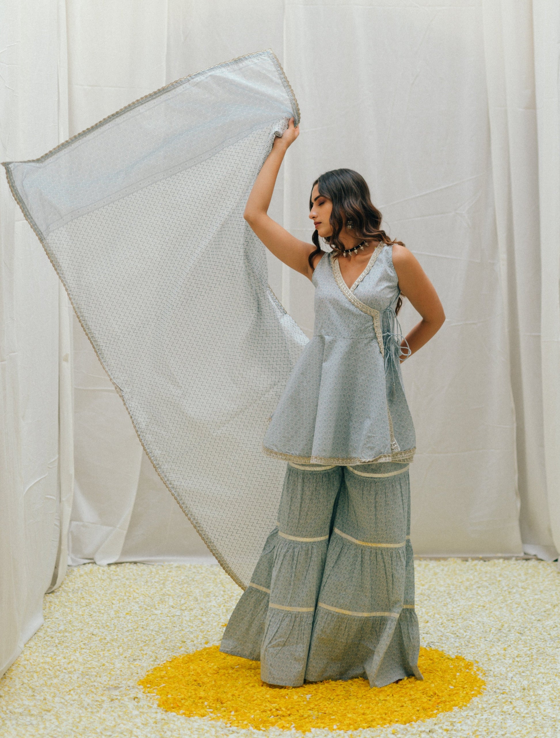 This kurta set has a sleeveless short peplum angrakha style kurta along with a tiered sharara having a fully elasticated waistband. The set comes with a matching flowy dupatta with gota detailing.