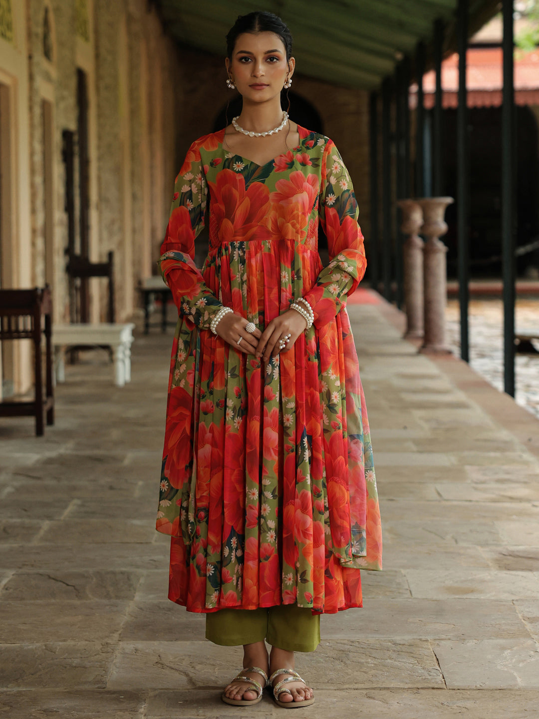 This Kurta Set has a 3/4th sleeves, Anarkali kurta with a sweetheart neckline, along with straight trousers having a partially elasticated waistband. The set comes with a matching dupatta.