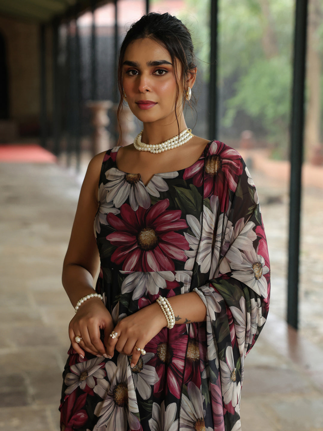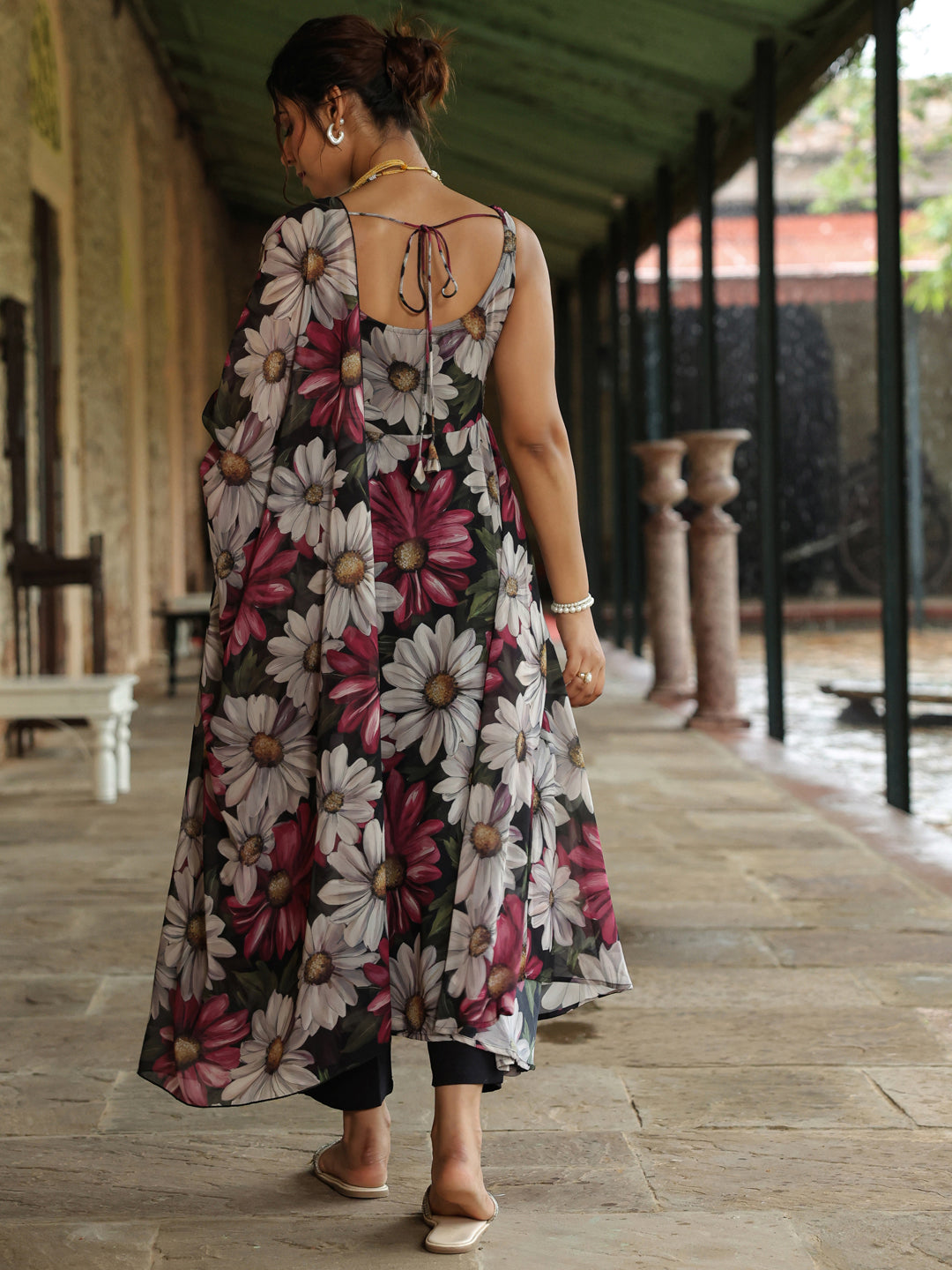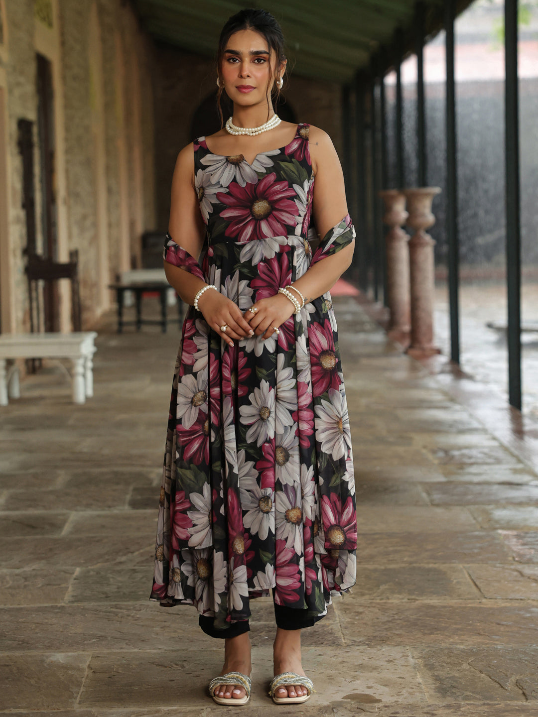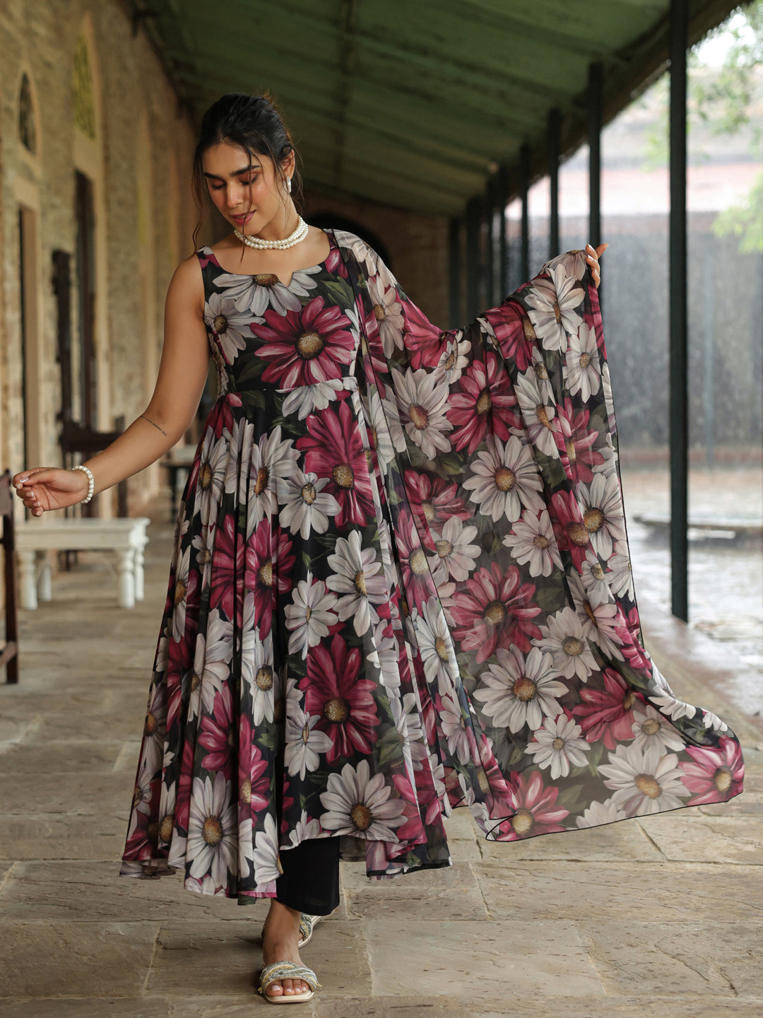 This Kurta Set has a sleeveless, notched neck, flared anarkali kurta along with a straight trouser having a partially elasticated waistband. The set comes with a matching flowy dupatta.